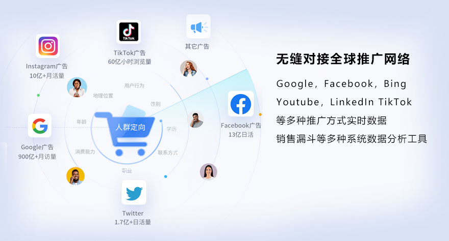 Google,Facebook,Bing,Yandex,Youtube,LinkedIn,TikTok,Pinterest等多种推广方式;